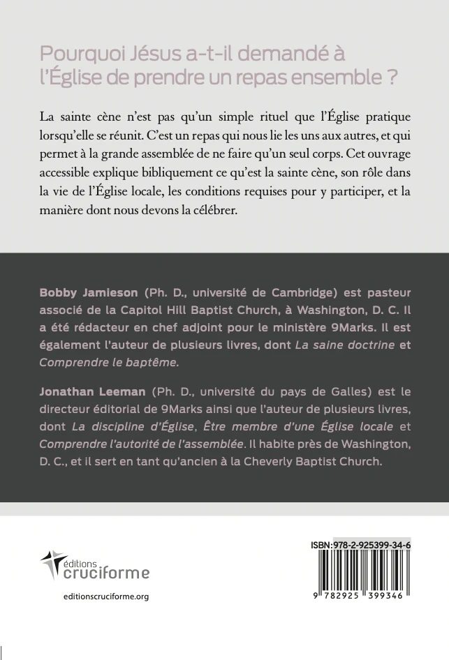La cène est un repas qui nous lie les uns aux autres, et qui permet à la grande assemblée de ne faire qu’un seul corps. Ce petit livre explique bibliquement ce qu’est la sainte cène, son rôle dans la vie de l’Eglise locale, les conditions requises pour y participer, et la manière dont nous devons la célébrer.